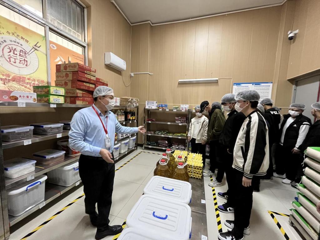 会前,食堂工作人员带领学生深入食堂各功能区,讲解了食堂管理制度建设、从业人员管理、各环节操作流程、原材料验收储存等情况,并向学生介绍了食品安全管理工作情况。